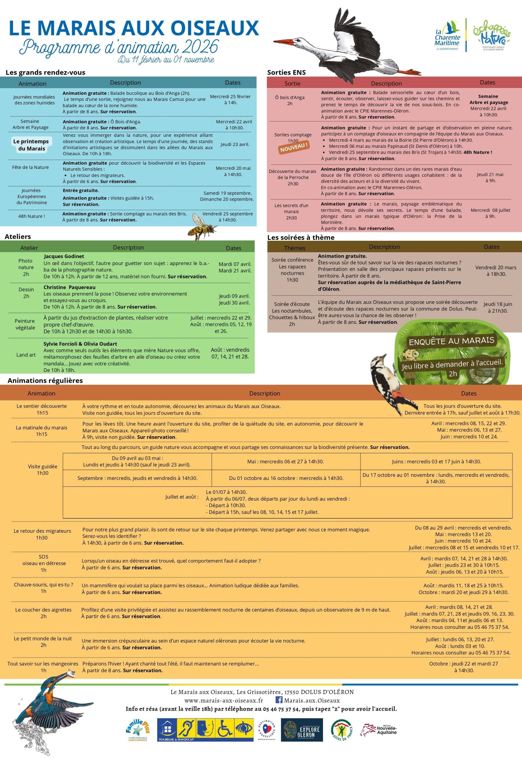 En 2026, une vingtaine animations différentes comme par exemple : Le coucher des aigrettes, C’est quoi un œuf ?, Le petit monde de la nuit, Chauve-souris, qui es-tu ? l’Atelier photo nature ou encore Le printemps du Marais ou le Retour des migrateurs sont proposées aux particuliers à des heures préétablies sur le site.